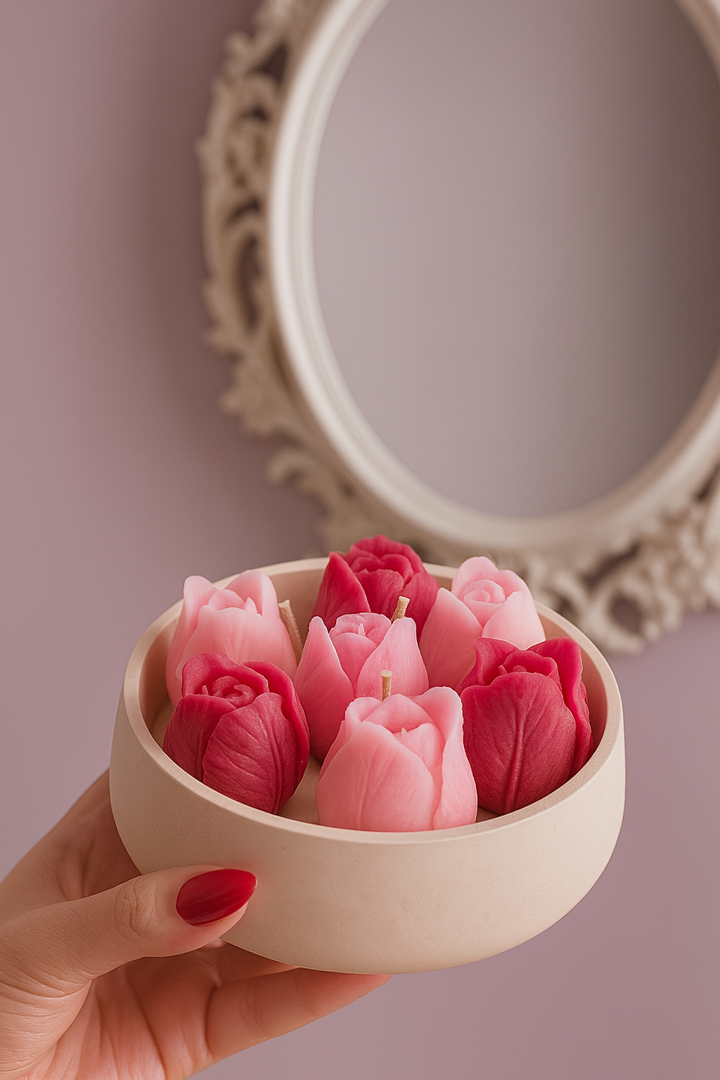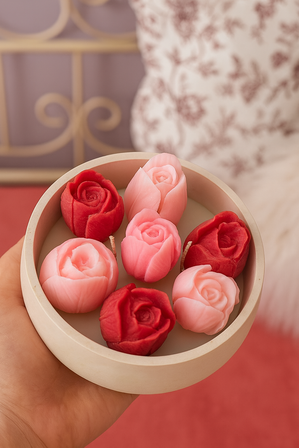 Τα μικρά ροδοπέταλα από κερί, σε αποχρώσεις του ροζ και του κόκκινου, δημιουργούν μια αίσθηση ζεστασιάς, τρυφερότητας και διακριτικής πολυτέλειας.